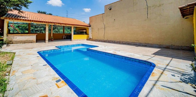 Linda Chácara dentro de condomínio com 3 quartos, sendo 1 suíte com armários planejados, ampla sala de estar, cozinha com armários, lavanderia coberta, 2 banheiros na casa principal, escritório com banheiro, amplo quintal com pomar e horta, piscina e salão de festas com espaço gourmet e churrasqueira, banheiro na área de lazer, ateliê e 4 vagas de garagem.