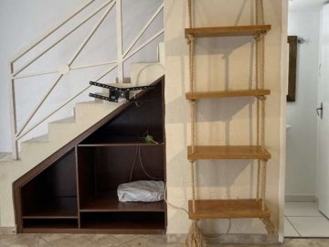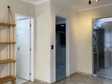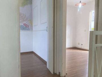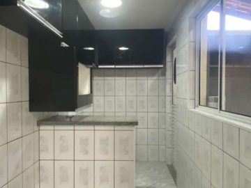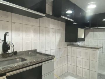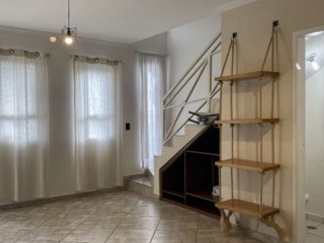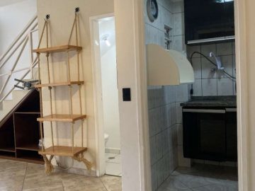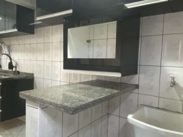 Lindo sobrado 2 quartos, sala para dois ambientes (estar e jantar), lustres instalados, detalhe com pintura em cimento queimado, prateleira decorativa e nicho para instalação de som e internet e piso em porcelanato, lavabo social com espelho, cozinha americana com armários, lavanderia, banheiro social, quintal coberto com espaço gourmet c/ churrasqueira e 2 vagas de garagem.