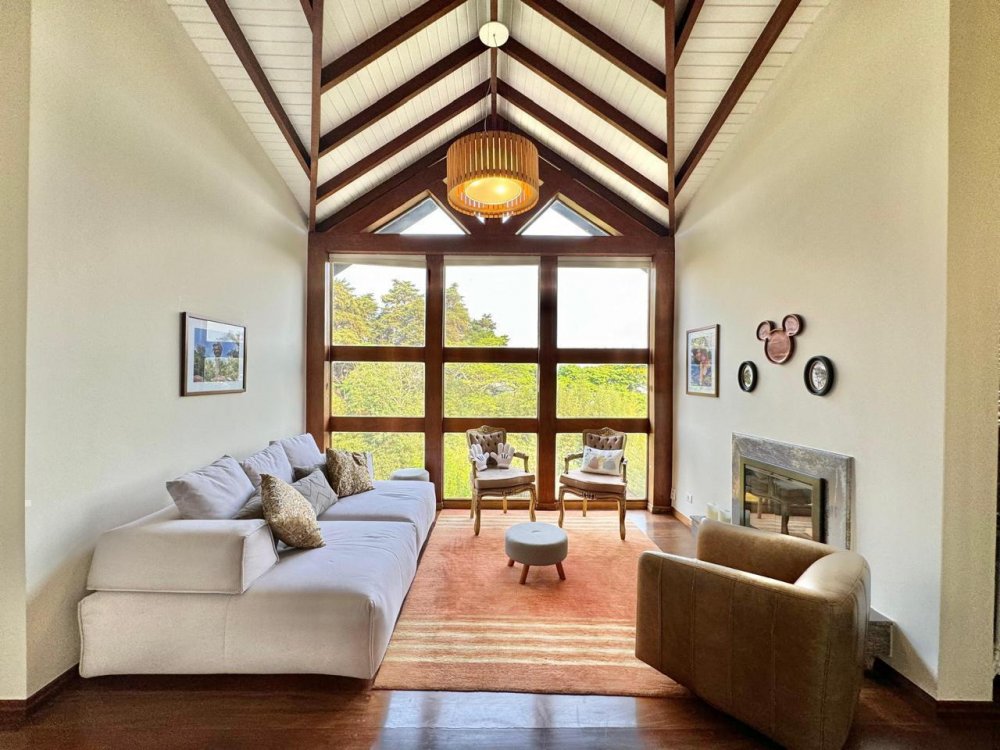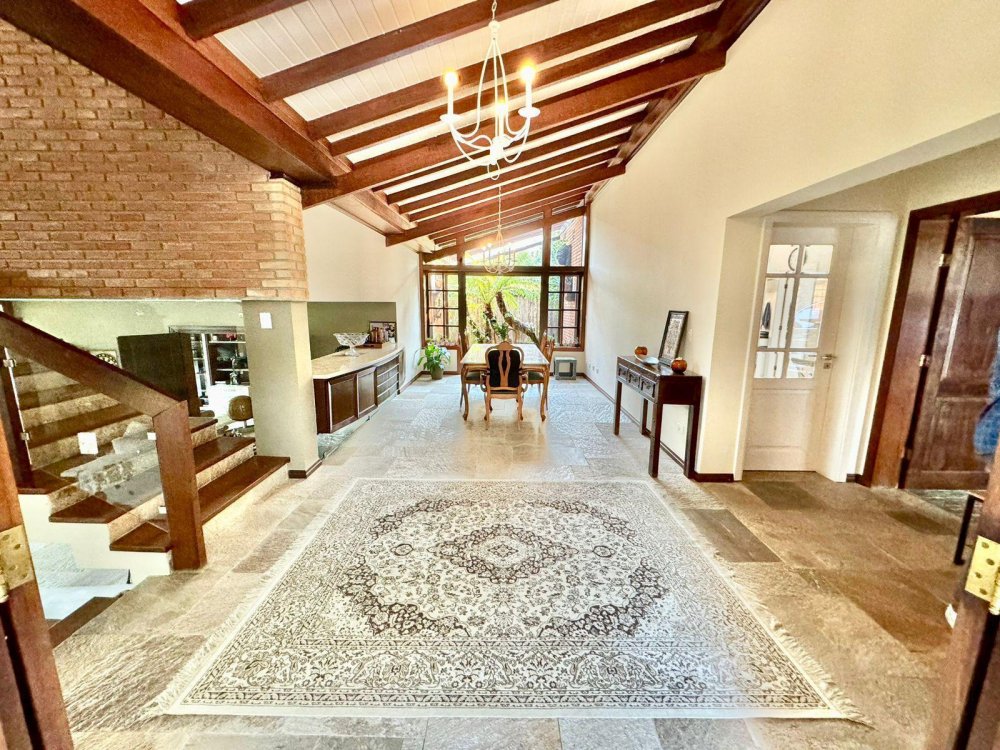 Ao entrar na casa, você é recebido por uma sala de jantar elegante, com uma conexão harmoniosa ao jardim de inverno. As salas de estar, lareira, TV e bar são integradas e se abrem para uma espaçosa varanda com vista para o deslumbrante jardim. A lareira, com acabamento em travertino e revestimento externo em pedra, adiciona um toque de sofisticação e aconchego.