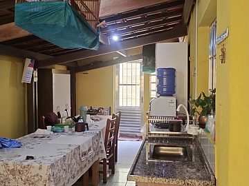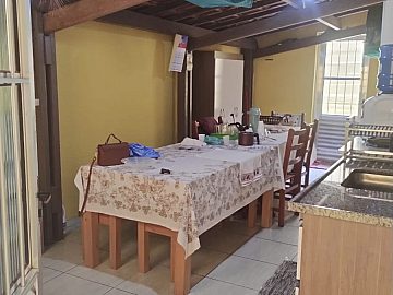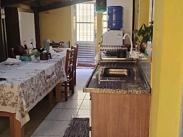 Casa Principal - Sala de estar, cozinha c/ armários, 2 quartos, sendo 1 com armários de madeira, banheiro social, lavanderia, espaço coberto aos fundos e garagem coberta para 4 carros.