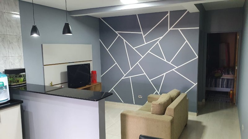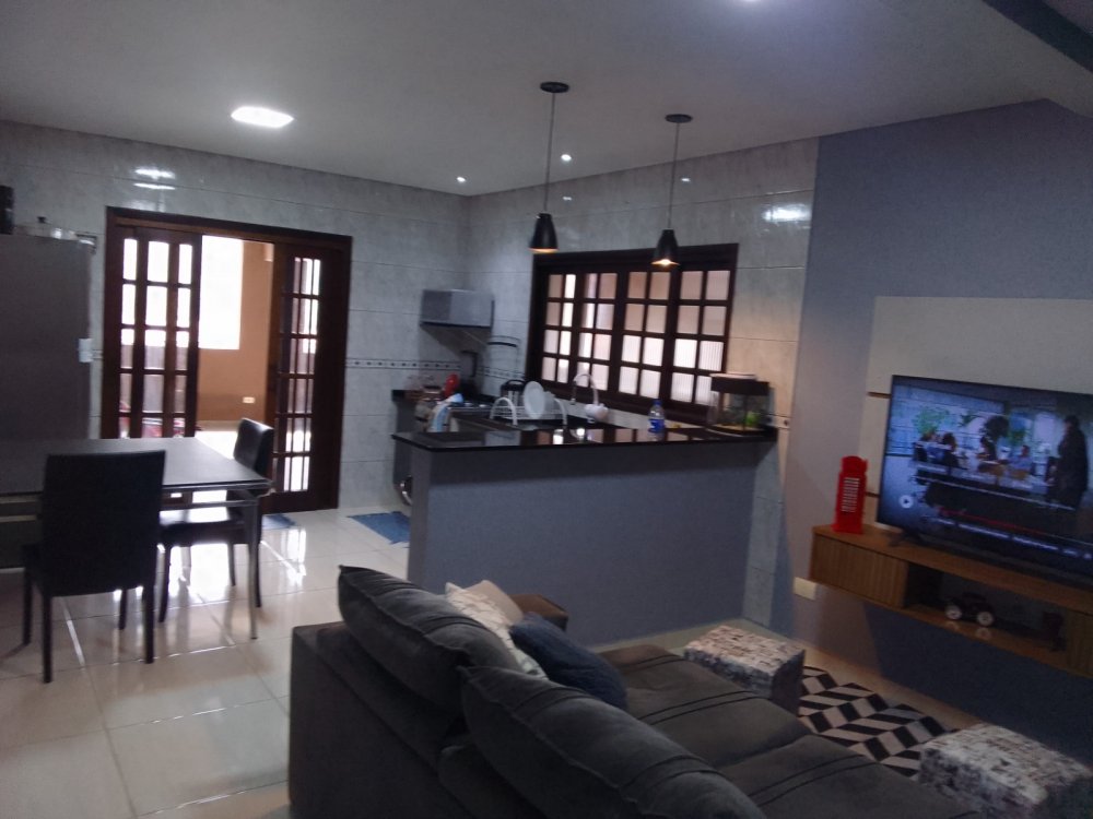 Lindo sobrado com sala de estar e sala de jantar, 1 quarto, cozinha, banheiro social, lavanderia coberta, varanda gourmet c/ churrasqueira (salão de festas) e garagem coberta para 3 carros.